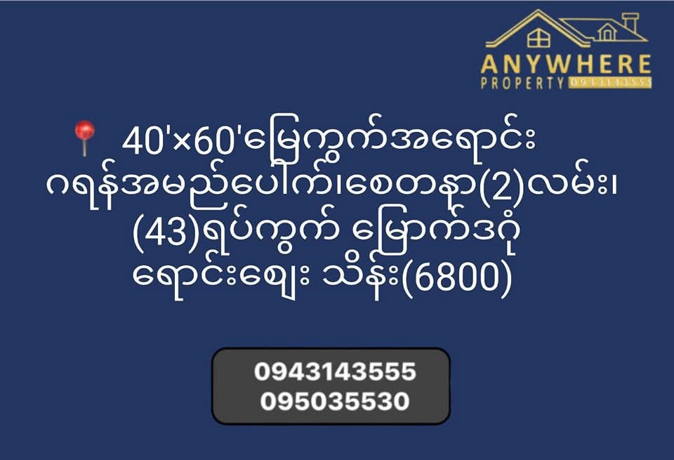 40'×60'မြေကွက်အရောင်း.... ဂရန်အမည်ပေါက်၊စေတနာ(2)လမ်း၊ (43)ရပ်ကွက် မြောက်ဒဂုံ။