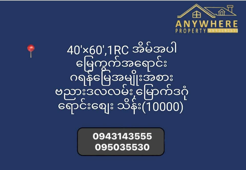 40'×60',1RC အိမ်အပါမြေကွက်အရောင်း...... ဂရန်မြေအမျိုးအစား.... ဗညားဒလလမ်း,မြောက်ဒဂုံ။