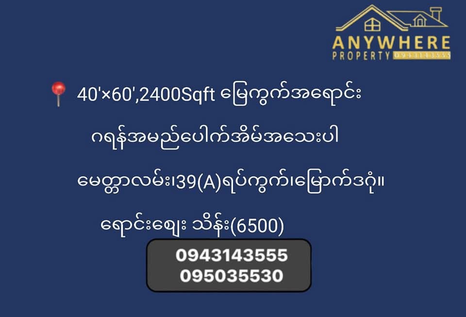 40’×60′,2400Sqft မြေကွက်အရောင်း..
