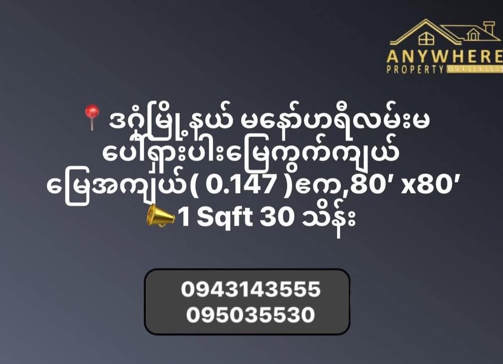 | Feature | #Downtown ဒဂုံမြို့နယ် မနော်ဟရီလမ်းမပေါ်ရှားပါး မြေကွက်ကျယ်အရောင်း ရန်ကုန်မြို့၊ ဒဂုံမြို့နယ် ပြည်လမ်းမကြီးအနီး၊ ဟယ်လ်ပင်မှတ်တိုင်အနီး၊ မနော်ဟရီလမ်း မှာ အရောင်းရှားတဲ့ မြေပိုင်မြေ မြေကွက်ကျယ် အမြန်ရောင်းမည်။ မြေအကျယ် ( 0.147 ) ဧက ပေ ( 80' 80' ) ဈေး = 1 Sqft 30 သိန်း မြေအမျိုးအစား မြေပိုင်မြေ အမည်ပေါက် မြေ လေးထောင့်ကျ For viewing the land: 0943143555 (အိမ်ကြည့်ရန်ဆက်သွယ်ရန်ဖုန်း) #ပိုင်ရှင်နှင့်တိုက်ရိုက်စျေးညှိနှိုင်းနိုင်ပါသည် လူကြီးမင်းတို့အိမ်ခြံမြေ၊လုံးချင်း၊ကွန်ဒိုအခန်းများ၊စက်မှုဇုံမြေတို့အား (ရောင်း၊ဝယ်၊ငှား)လိုပါက Anywhere Property Company သို့ယုံကြည်စိတ်ချစွာဆက်သွယ်အပ်နှံနိုင်ပါသည်။ (ပိုင်ရှင်များတိုက်ရိုက်ဆက်သွယ်အပ်နှံနိုင်ပါသည်) Page မှာမတင်ထားတဲ့အခြားသော data များစွာရှိတဲ့အတွက်လူကြီးမင်းတို့သုံးချင်တဲ့budgetအတွင်းဝင်အောင်စိတ်တိုင်းကျသည်အထိရှာပေးပါသည်) -အတွေ့အကြုံရှိအိမ်ခြံမြေရှေ့နေများဖြင့်အရောင်းအဝယ်စအလယ်အဆုံးတိကျမှန်ကန်စွာစာချုပ်ချုပ်ဆိုပေးပါသည်။ www.anywhereproperty.com.mm Email: anywheremyanmarproperty@gmail.com #land#လုံးချင်းအိမ် #ဒဂုံ #မနော်ဟရီ #houseforsale#goldenvalley#inya#inyamyaing#thanlwinroad#pyayroad#yankin#northdagon#hlaing#bahan#everyone#realestate#property#anywhereproperty 0943143555 |